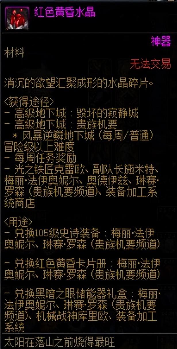 通关毁坏的寂静城可以获得红色黄昏水晶:用来兑换105级史诗装备礼盒,兑换红色黄昏卡片册 ,可以开出传说卡片。可以获得金绿柱石:用来升级装备词条等级、兑换高级地下城门票等。