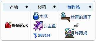 在放置的瓶子或炼药桌处使用1个水瓶、1个公主鱼和1个寒颤棘,即可合成获得1个爱情药水。