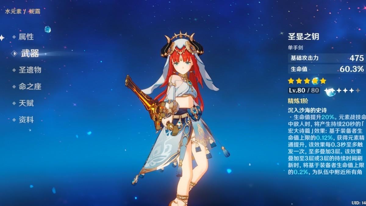 妮露的五星武器首选当然就是外观被大家嫌弃到爆的专武圣显之钥,主属性提供妮露最优先需要的生命值%数,而且这把武器精炼等级越高,给妮露的生命值加成空间越多、给整体队伍的元素精通加成效果也会越多。不论是妮露的输出伤害、又或是给队友的绽放伤害加成面面俱到,除了外观非常之不搭之外,其他都非常完美。