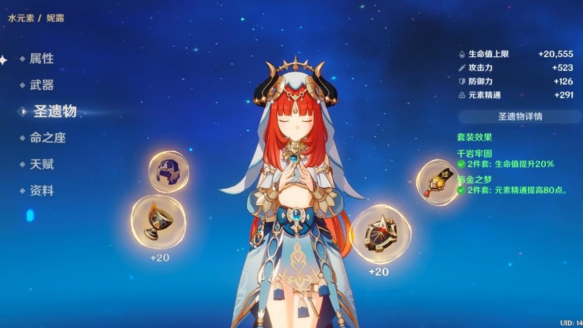 圣遗物搭配的部分主要就是以无脑堆高生命值为目标,圣遗物绑定千岩2件套,以及其他2件套,像是提升水伤的水套2件、提供元素精通的饰金2件、流浪2件都可以。如果是水伤输出玩法的妮露,则会建议千岩2件+水套2件。圣遗物主属性方面,辅助向妮露不用管双暴,圣遗物不论主副属性全部堆生命值为优先,副属性考虑生命值、元素充能效率或元素精通。输出向妮露,时之砂生命值%数、空之杯水元素伤害、礼之冠以生命值%数或双暴为主,副属性考虑双暴、生命值、元素精通或元素充能效率。