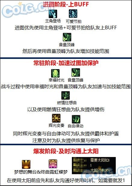 通过释放乐谱同时输入对应音符可激活技能,给队友提供各样的属性加成例如:加速,回血,提升技能范围等等