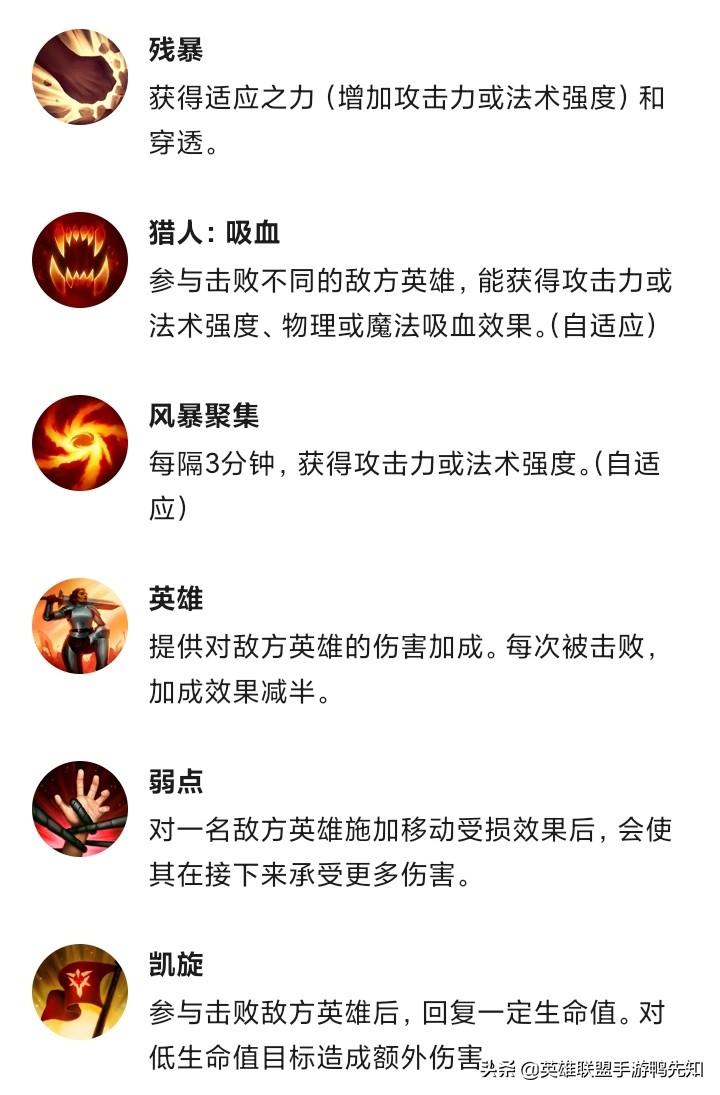 使用不同的技能或多次普攻命中一名敌方英雄时,可获得爆发性的移动速度加成与减速抵抗,适合没有位置容易被风筝的英雄。推荐英雄:诺手,雪人等