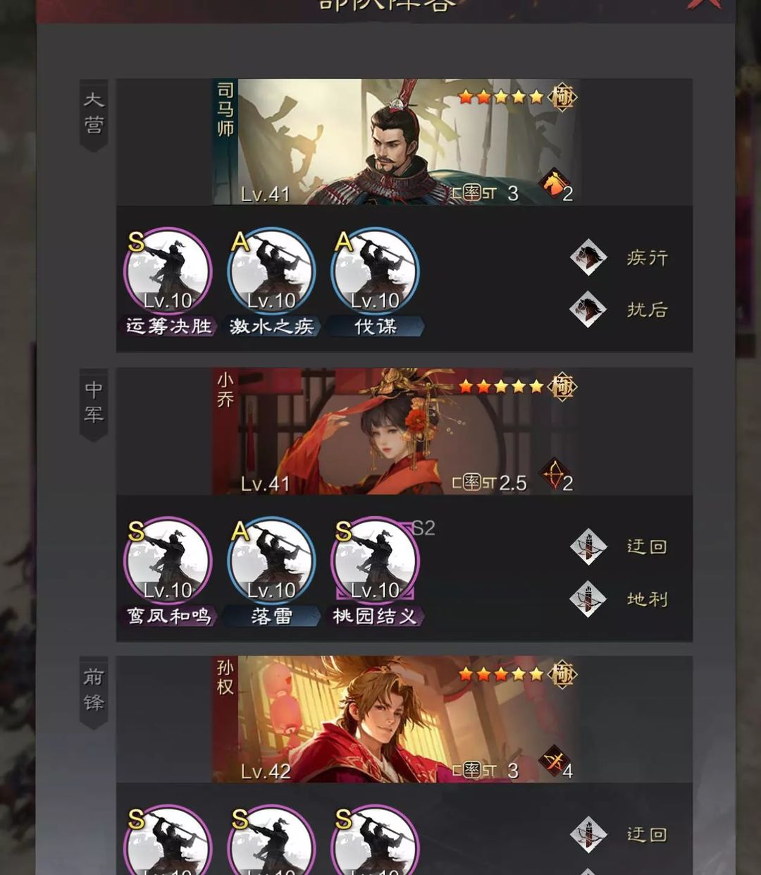 指挥类主战法,吃主动战法发动,所以我们还是想到了瞬发(瞬发主动谋略战法不动,也就成了断板)但是她主战法还有:增加控制回合,全体3目标,意思很明确了小乔也可以吃到! 所以落雷、迷阵的瞬发就很搭配了