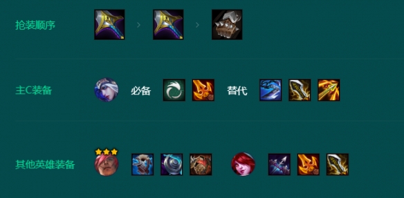 征服者自带暴击,艾希优先做攻击装备,锐利之刃增加的伤害是最高的。第三件优先补巨人捕手,可以更快处理四费卡和三星阵容。其次可以做无尽之刃增加爆伤,卢安娜的飓风增加平A伤害。副C选择霞,依旧是攻击力装备优先。