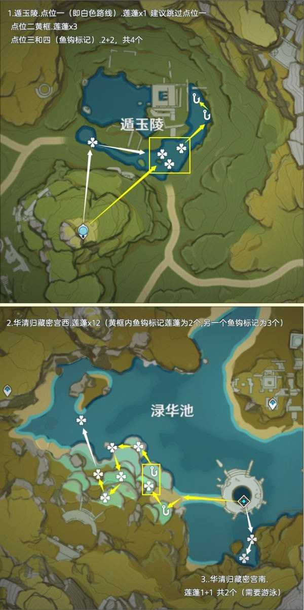 关于获取数量:黄色路线总共63个莲蓬(不包含购买),另外需要游泳或者超远跑图的白色路线还有26个莲蓬