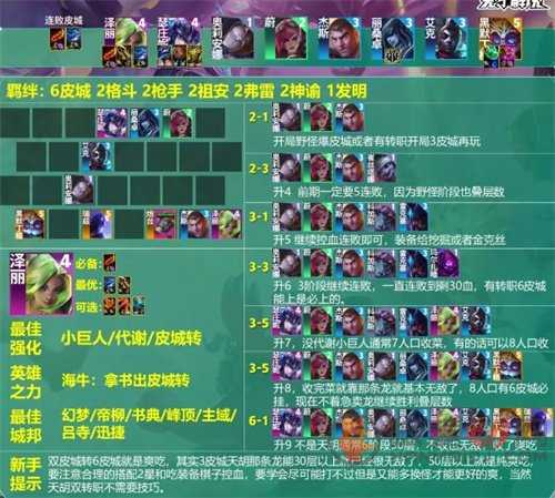 在皮城阵容一般是建议2-3前达成3皮城,如果没有那么不推荐玩,达成3皮城后一定要走连败攒霸王龙层数,并且开局的传说之力一定要选择海牛这样就可以开局有纹章之书,等着皮城转职就行。达成6皮后可以继续连败攒成熟达成50层以上后再去考虑收菜。