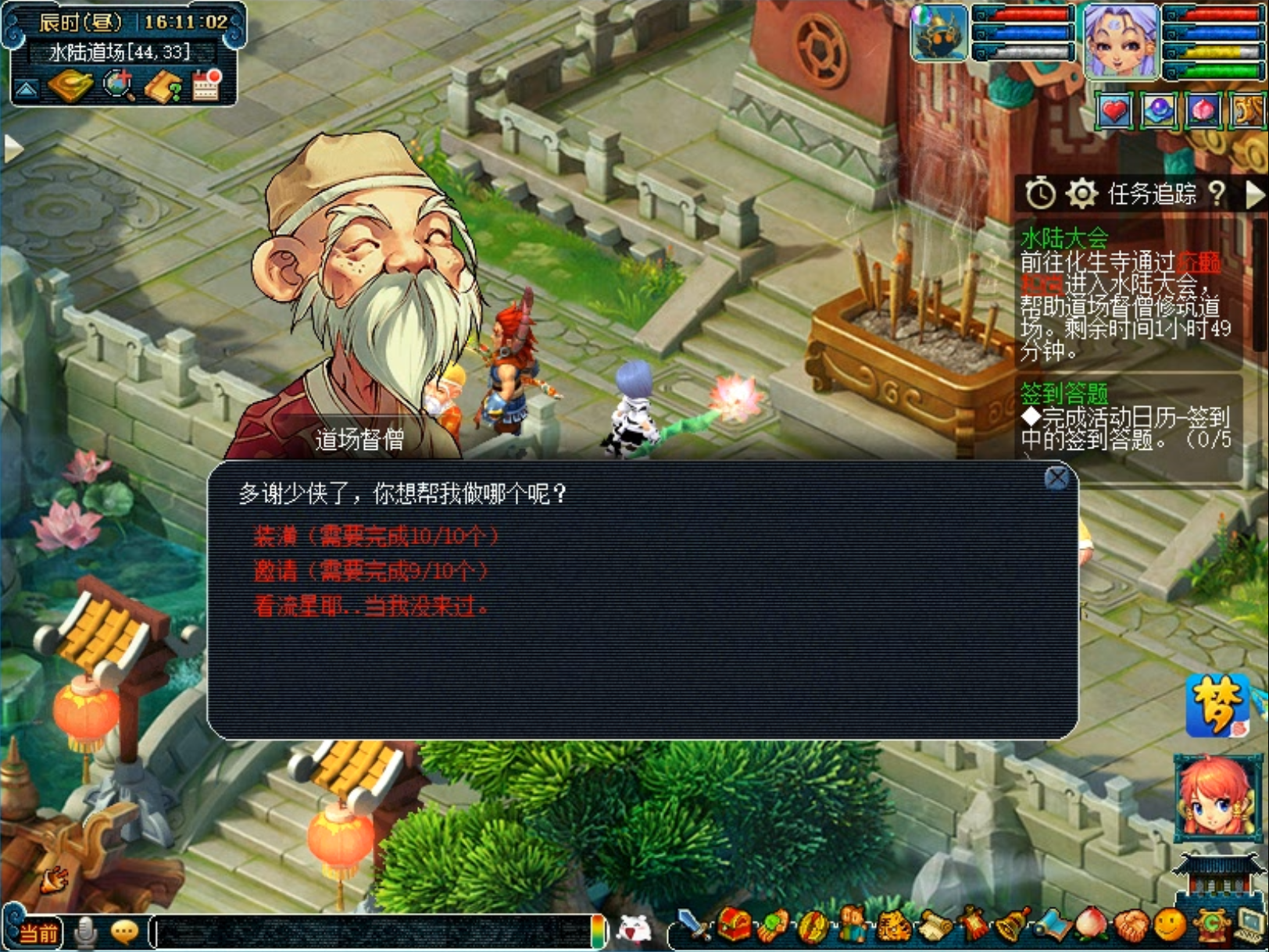2.接着水陆道场内,对话道场督僧,完成10次装潢、10次邀请任务,均为单人任务。装潢是对场景后院的桃树点击对话、完成任务即可。邀请就是从水陆道场门口进入副本长安场景,点击对应的NPC对话即可。【同种类型装潢任务可以组队完成、但也快不了多少】