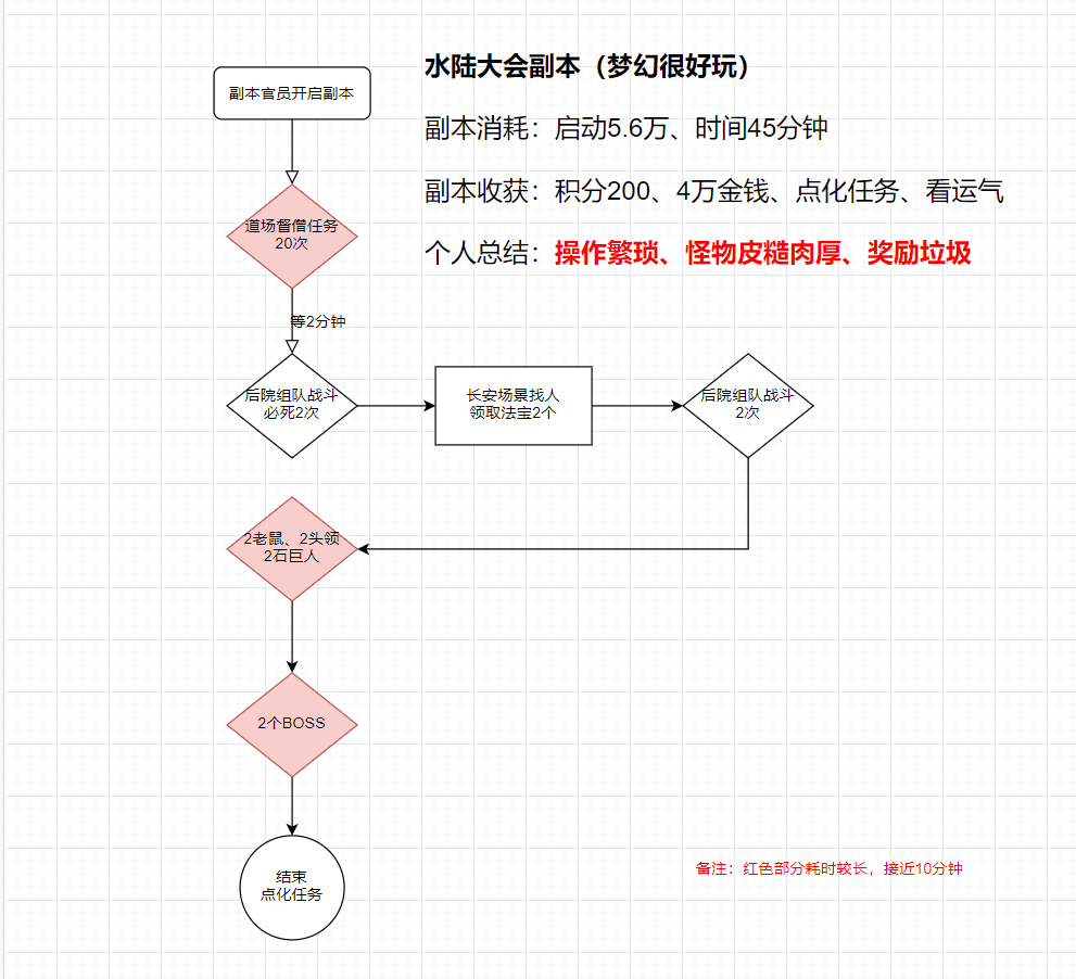 水陆大会副本作为一个古老副本、5人可刷、难度不高、操作繁琐、奖励垃圾(意外物品除外)。以下参考信息,均来自梦幻最效率的129普通飞升队伍。