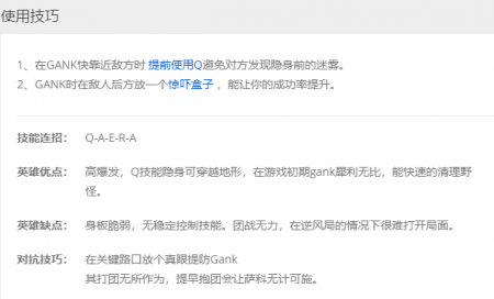 至于连招方面,小丑没有固定的连招,核心可以说就是利用Q技能隐身来埋W盒子和释放假身迷惑对手。不过QW通常是用来GANK时封走位使用,作为上单可以经常使用的也就是QR连招,可以在进草对手丢失视野的一瞬间QR,这样对手一头扎进草里就只会发现小丑的一个假身,从而误以为是真身从而疯狂输出。不过这一招也是需要心理博弈的,一般对手上一次当以后,就会谨慎许多。