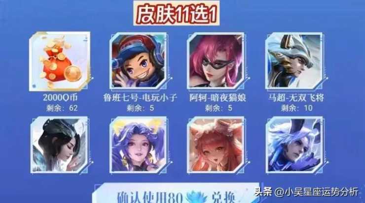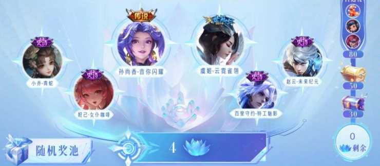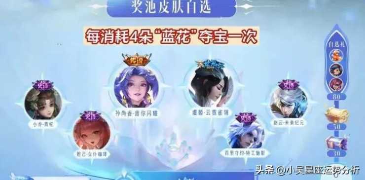 3、蓝花可以在商店兑换紫色/金色宝箱或自选奖励以及皮肤,或者是进行夺宝抽奖活动,有概率可以获得虞姬云霓雀翎、孙尚香音你闪耀和小乔青蛇等高级皮肤;