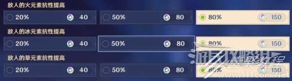 下面是三种元素抗性词条,如果三个抗性都选择最高百分比的话,在后续配队时可以选择除这三种元素之外的元素角色来组队,例如水、岩、风元素,但除水岩风之外元素的辅助角色也可以使用,配队如万达国际、绫人夜万钟等。