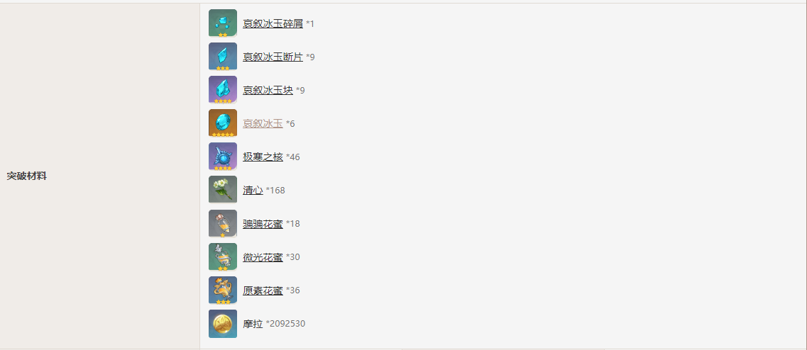 5. 70级突破材料:100000摩拉、哀叙冰玉块6个、极寒之核12个、清心45个、原素花蜜12个