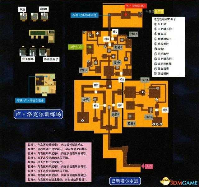 准备好之后经过第三话回合地点的传送阵进入训练场,进入之后马上开始强制战斗。敌人攻击力很高,而且有气绝效果。战斗后进入训练场宿舍,宿舍内有不少宝箱。离开宿舍进入巴斯塔尔水道。水道的水变成了岩浆,在里面行动会按时间损失HP。按照地图中的标注,这里的控制杆很多时候向左向右摇动的效果不一样,请依照说明收集全部宝箱并调查星之门⑤之后继续前进。