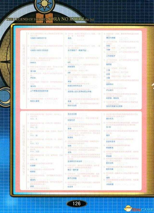 【太阳之门⑤】要求有全部种类的耀珠才能进入。是一个问答小游戏,都是关于轨迹系列的各种问题,就看你是否细心了。(附图:P125~126)PSP玩家注意,PSP版追加了一个Maniac难度,奖品为刻耀珠(驱动3,驱动时间减少95%,STR/DEF降低20%,ATS降低15%)
