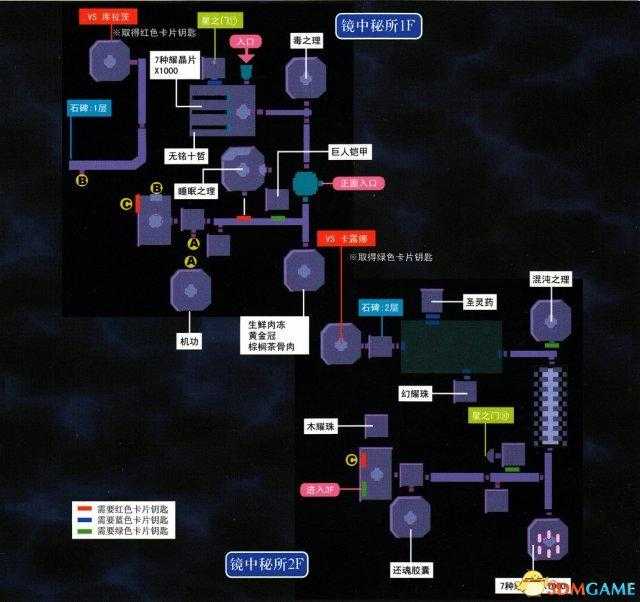 2F有红色和绿色的机关桥,所有同色机关桥是连锁的,桥旁边的机关可以调整颜色,机关为红色时红桥架起绿桥消失,反之亦然。建议先拿到装备“巨型弩”,之后来到图中①的位置,切换装置后拿完还魂粉之后到③的位置,取得“ID卡片II”,回到②位置,切换装置颜色,通往3F的桥就架起了,使用ID卡片II就能继续前进了。