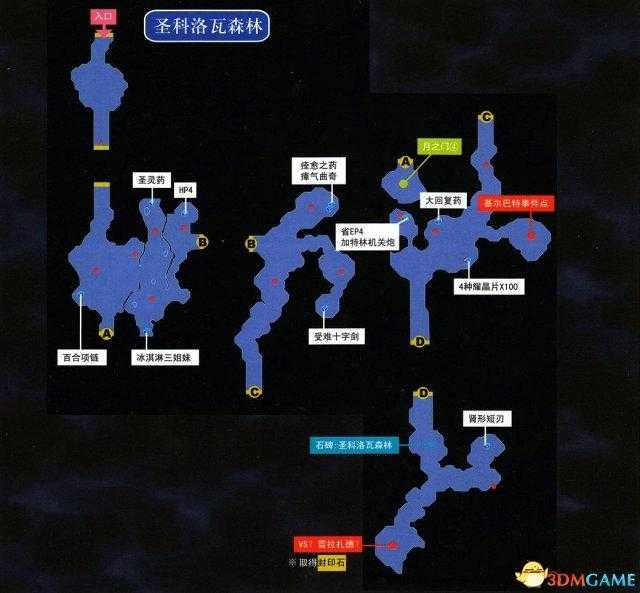 森林内不要忘了收集宝箱、调查月之门④,在图中C-D路上还会再次营救基尔巴特。