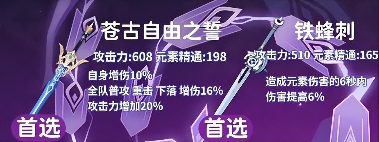 苍古自由之誓:能够为久岐忍提供高额的元素精通,这样久岐忍的治疗量就有保障了。加上被动的全队伤害加成,对久岐忍来说是十分的契合。