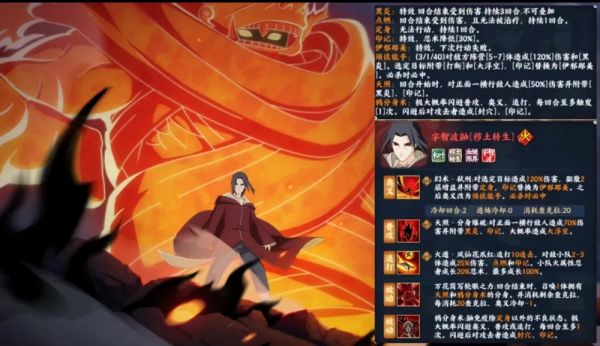 登场的时候肩膀上有一只乌鸦,秽土鼬的普攻有七段,其中有三段是变成乌鸦,是有无敌效果的,他的普攻还有一个隐藏操作,就是4A上挑的时候松开按键就会在平地汇聚成乌鸦,而不是在天上变成乌鸦。一技能是月读抓取附近的敌人,然后用草薙剑进行攻击,使用一技能不管有没有打中人都会增加一格能量,如果一技能打中敌人就是草薙剑打中了人会额外增加一格能量,能量满三格之后一技能会变成加强版月读,技能的范围和伤害都会有所提升。