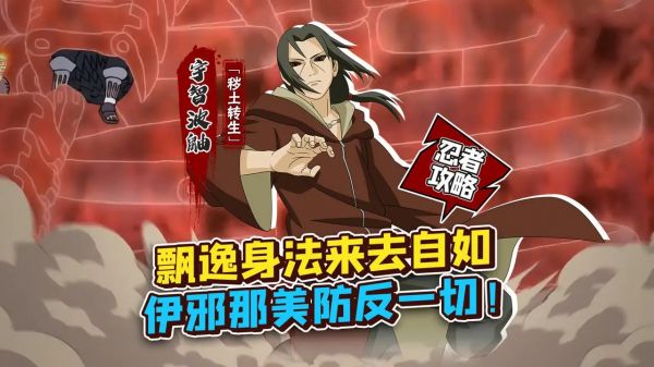 二技能则是变身成乌鸦并向前突进一段距离,再突进结束后会在原地放下一个分身, 根据测试是不能控制Y轴移动的,在大约四秒之内再次点击二技能秽土鼬就会结印防反,这个结印是可以长按来延长持续时间的,在结印的时候如果没有受到敌人攻击就会回到分身的位置,如果受到了敌人攻击就会和敌人互换位置,敌人的技能就会打中它自己,并且会受到秽土鼬的乌鸦和手里剑的攻击,而防反成功的秽土鼬是没有掉血的。秽土鼬携带密卷此处非,他的秘卷就会变成伊邪那美,伊邪那美也是一个防反技能,如果防反成功,秽土鼬就会变成乌鸦飞到敌人放技能时候的位置,秽土鼬每次放伊邪那美都会记录自己受到了哪个技能的攻击,这个效果在敌人的视角中会播放之前的战斗回放,而在秽土鼬的视角敌人是被定在原地不能动的,这个定身的过程大概持续五到六秒。