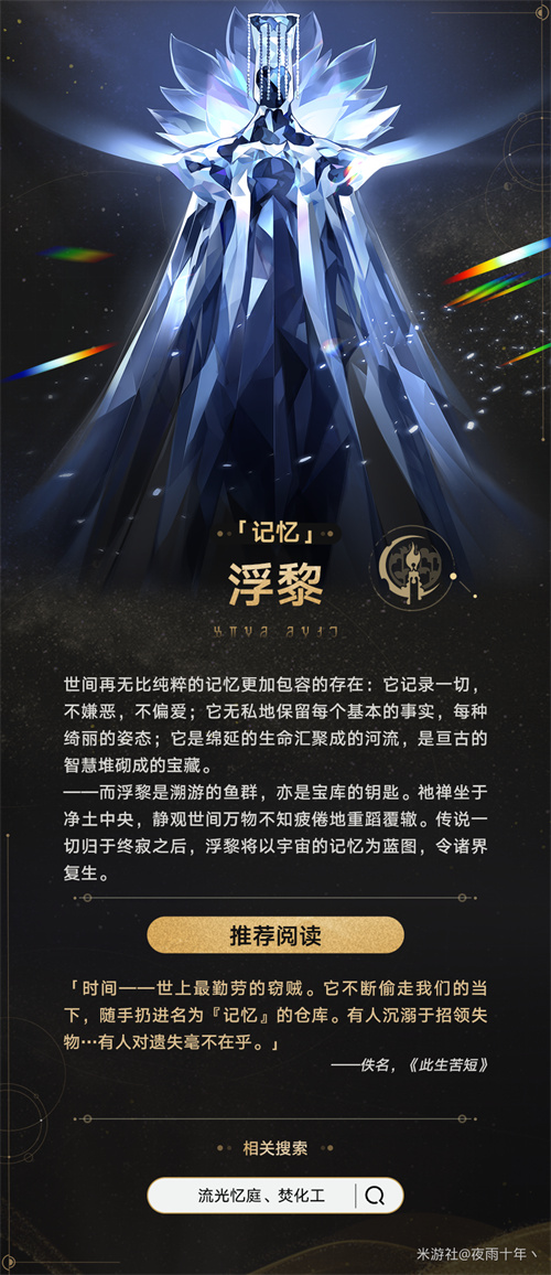 逆时而行的生物,执掌「终末」命途的星神。穿行于宙域之间的幽灵,喃喃宣布着必将实现的预言,和记忆星神正好相反的,简单理解就是,正常就是从生到死,它是从死到生,全是反过来的。