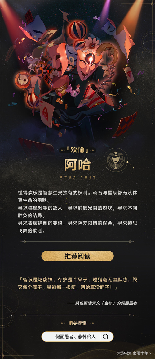 懂得欢乐是智慧生灵独有的权利。顽石与星辰都无从体察生命的幽默。寻求棋逢对手的敌人,寻求消磨光阴的游戏,寻求不问胜负的结局。寻求捧腹绝倒的笑谈,寻求阴差阳错的误会,寻求神思飞勺歌谣。曾经爬到过虚数之树的枝头了解宇宙真相后直接呆滞,直到听到婴儿的啼哭后笑了出来,于是就升格为-「欢愉星神」阿哈,可以说「欢愉」阿哈其实是真正对世间生命友好的星神之一,尊重一切乐子人。