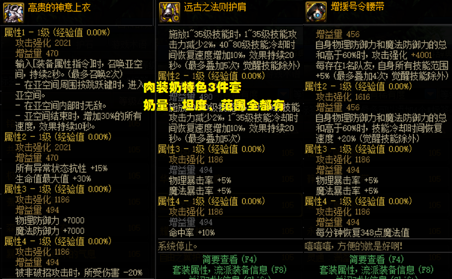 以“神意上衣+远古头肩+增援腰带”为搭配核心,虽然说是“肉装奶”,但其实用“功能性”来形容更加合理。