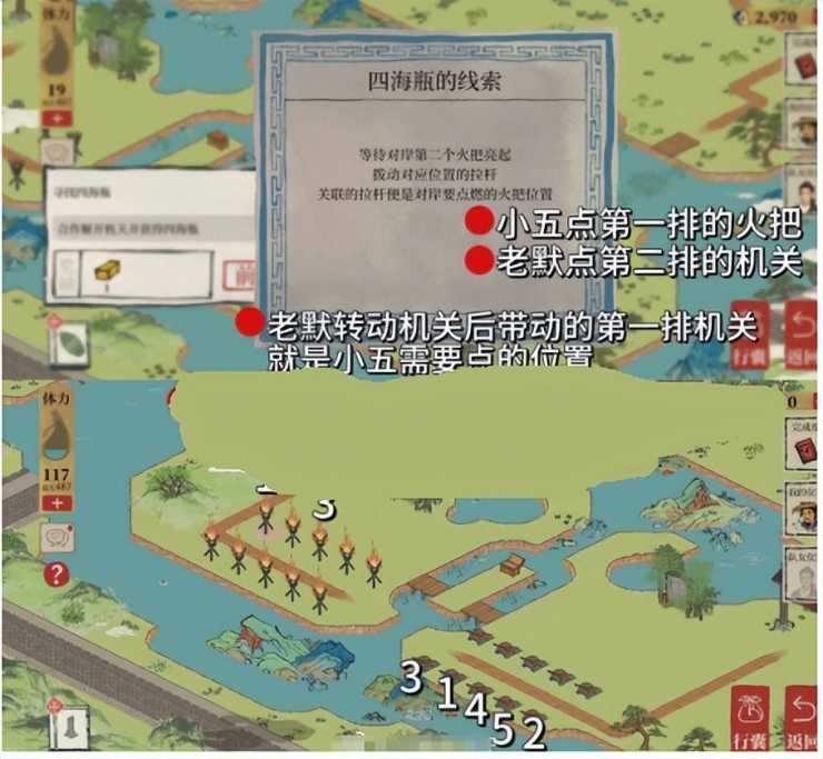 6、四海瓶的线索:两人配合交替操作,先点燃火把,再拉杆