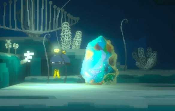 出了鲛人村,前往深海地区。遇到巨口鲨之后左拐,游到头,有一条向上的通道,生活着一群水母,通过通道即可看到矿石