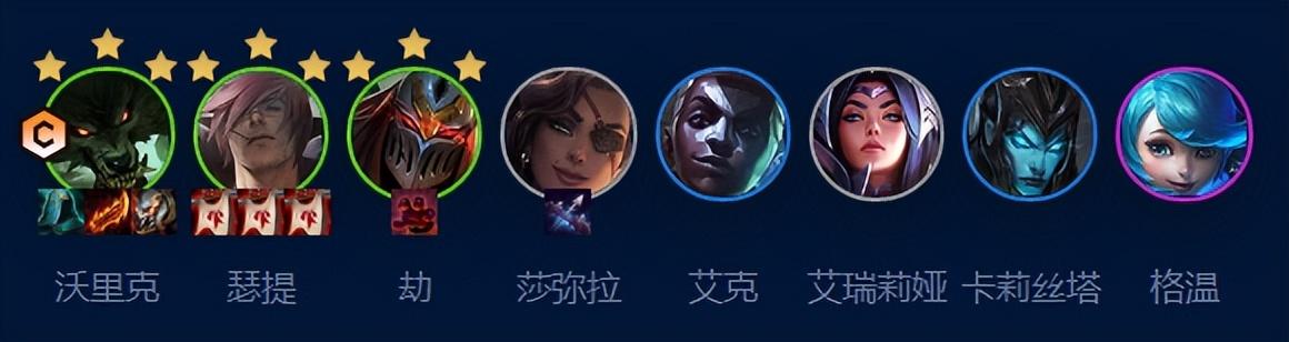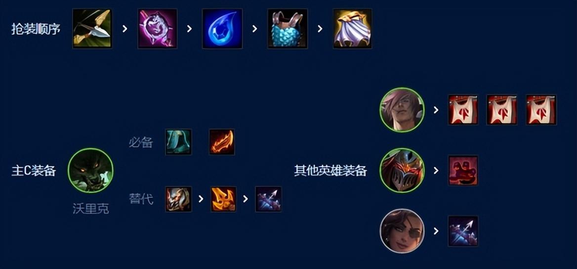 狼人的三件装备是必备的,同时狼人启动速度不够需要棋子来补充,瑟提旗子越多越好,劫作为副C偷偷就是最好的装备