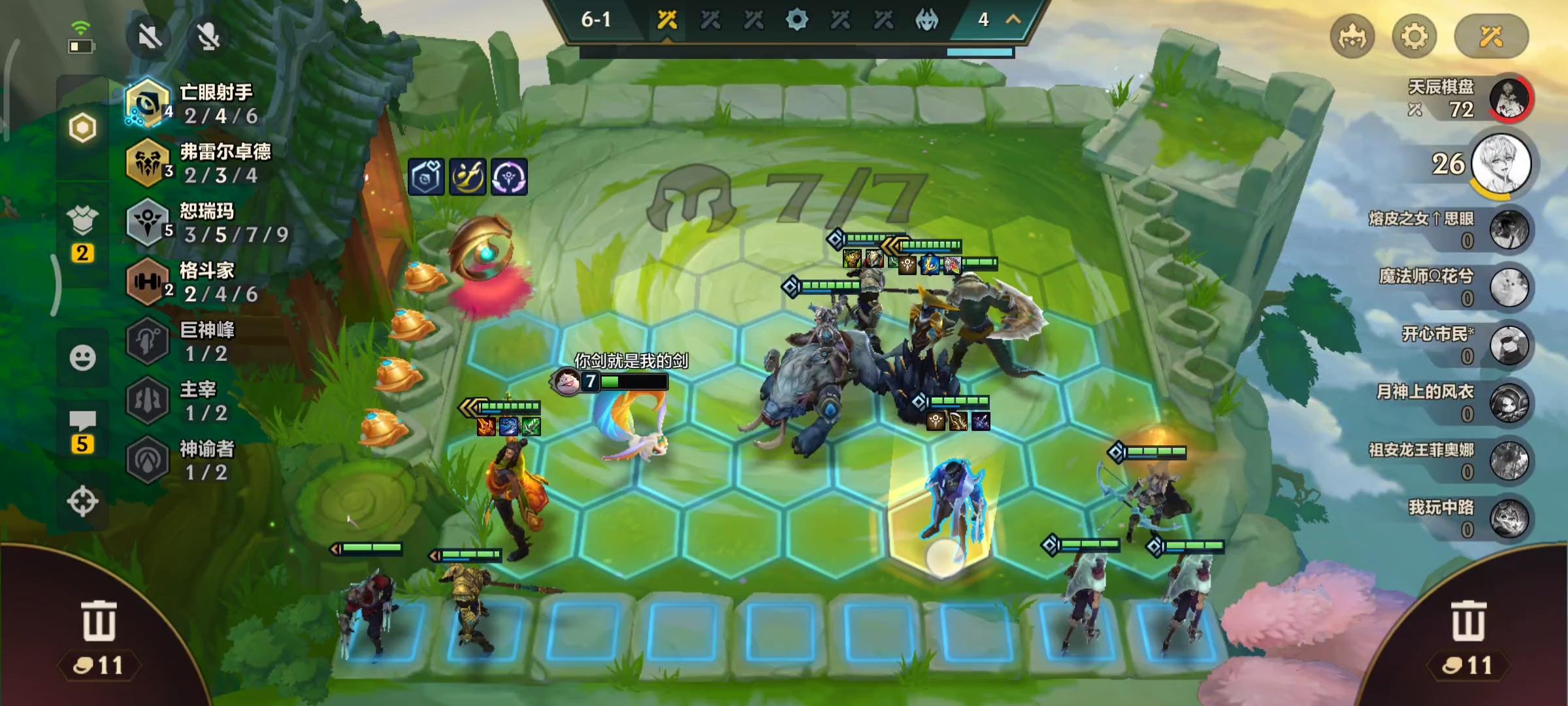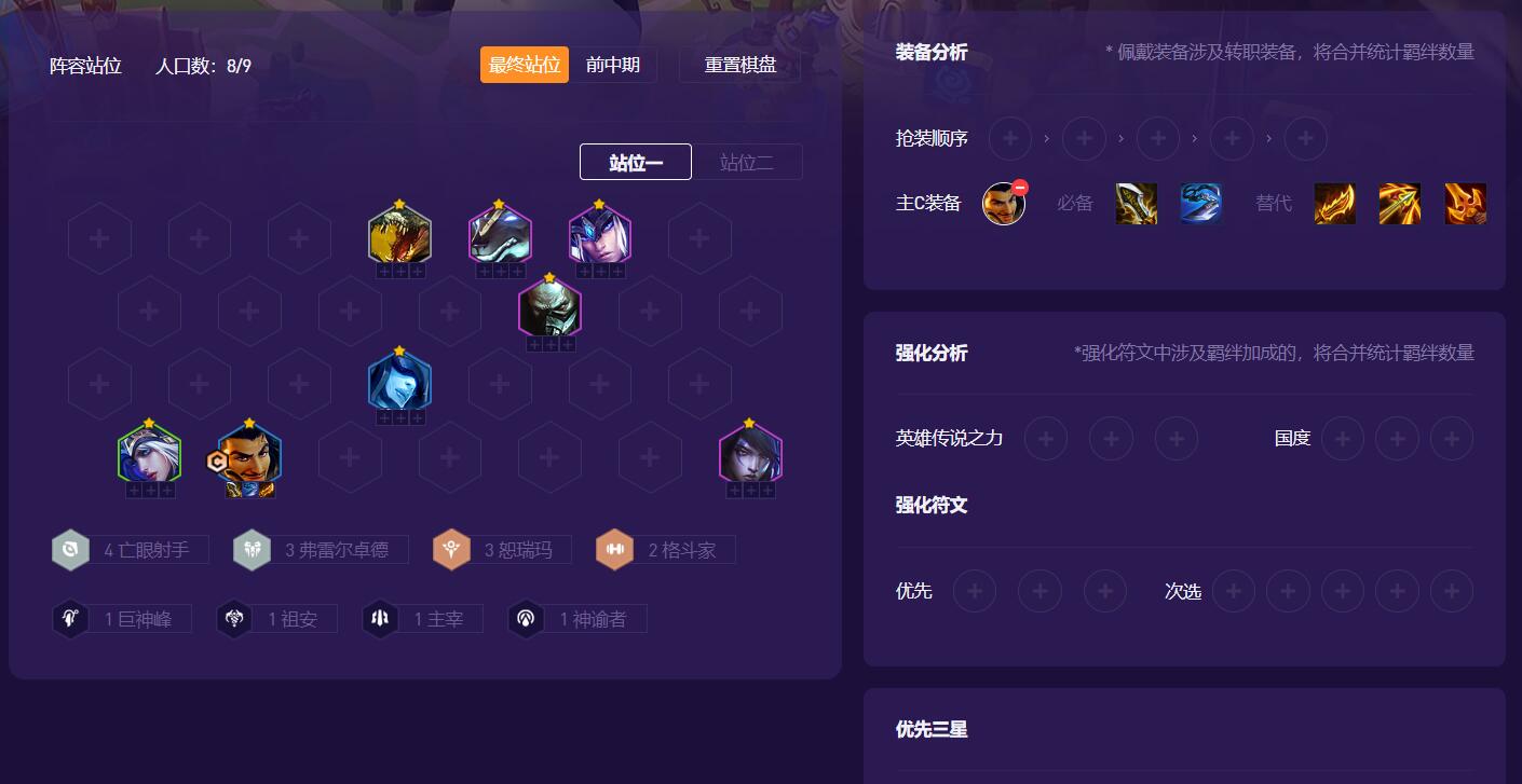 前排可以选择格斗家,毕竟,此阵容中的雷克顿就是格斗家。要是前期锁血不太顺利,六人口就可以小D一波了,最好是刷出阿克尚,6人口刷三费卡的概率有30%,与七人口相比,只差了5%而已。