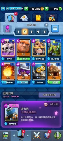 推荐原因:圣水消耗量少,有攻有防,如果对面选择的是高耗率卡牌的话,完全可以打他一个措手不及,并且卡牌容易集齐。缺点是,容易被女武神这种英雄压制,并且生命力低。