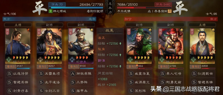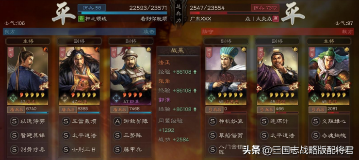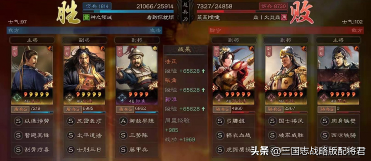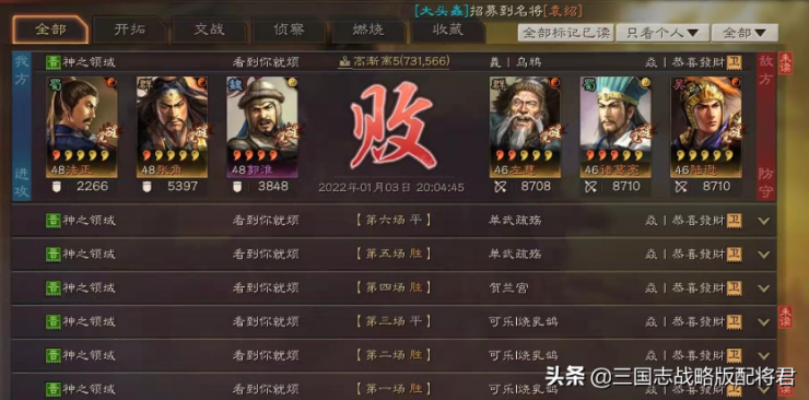 总结:对抗各种满红或者各种主流队伍,最终以较低的战损赢了下来,单从这点来说就已经是个非常不错的战绩,关键个队伍的武将红度还是偏低的情况下,如果是满红的话提升空间还能更高,在战损方面还能往下降一降,这结果就非常夸张了!