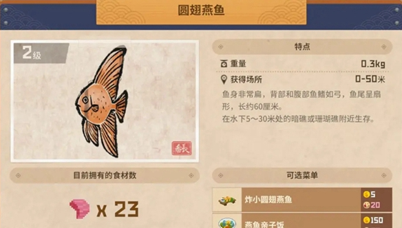 潜水员戴夫中有很多的海洋生物,这些生物能够用来制作出美味的寿司,圆翅燕鱼属于3星的食材,生活在水下5-30米处的暗礁或者珊瑚礁附近,其腹部和背部的鱼鳍像弓箭形状,整体呈现黄褐色,是非常美味的食材,很多玩家都不知道怎么捕捉,一起来看看吧。