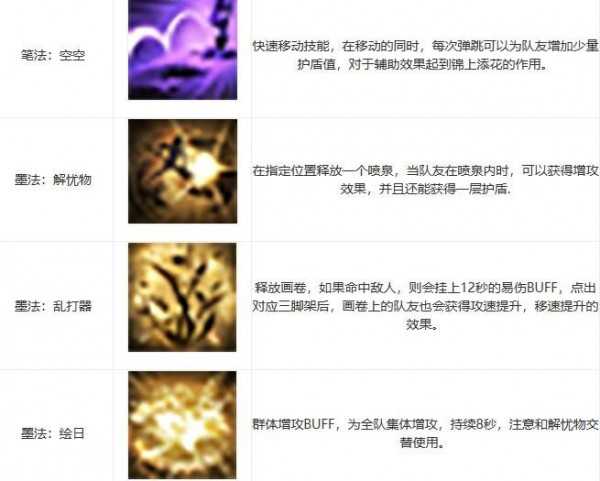 1、输出墨灵在团队中输出墨灵需要负责给队友提供buff并且给敌人附加增伤buff,还需要补充伤害所以推荐携带笔法向上、笔法喷洒、笔法绘日等技能。