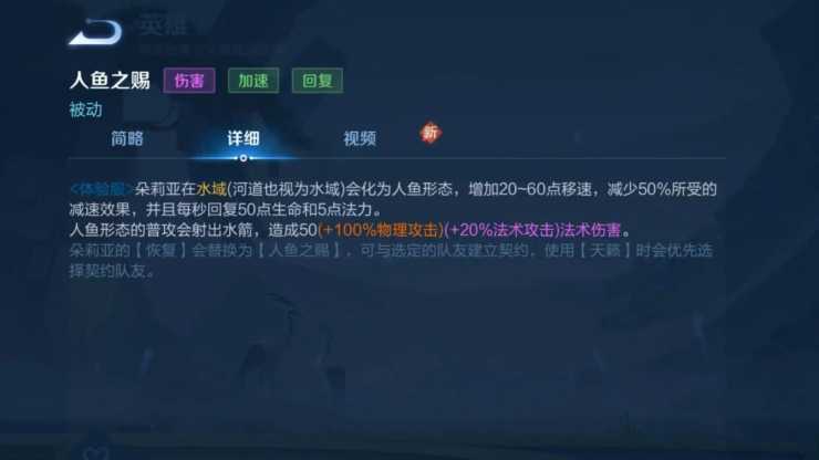 被动技能:人鱼之赐,朵莉亚在水域中会化为人鱼形态,获得20~60点移速,减少50%受到的减速效果,且每秒持续回复50点生命值和5点法力。