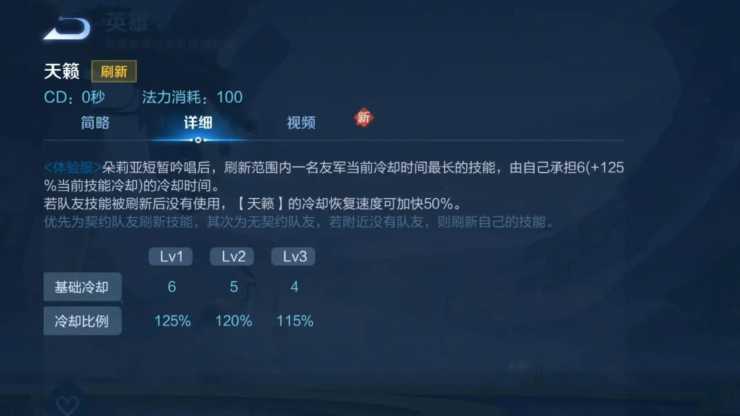 三技能:天籁,朵莉亚短暂准备后,刷新范围内一名友方英雄冷却时间最长的技能,由自己承担技能的冷却时间。