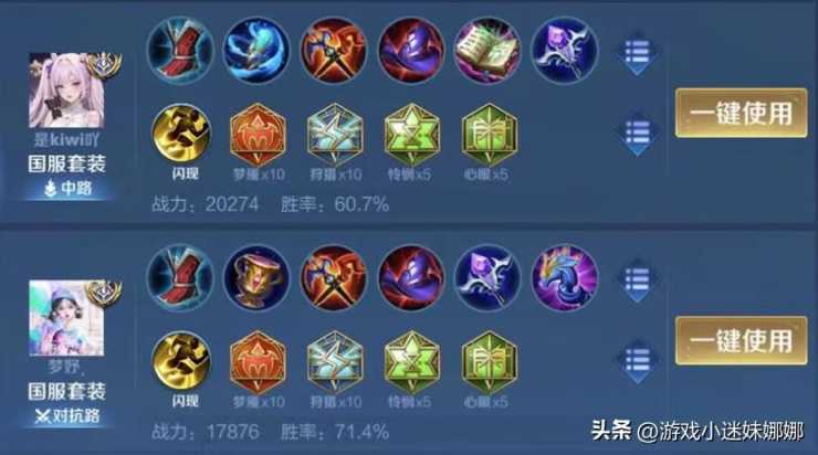 然后我们来看看杨玉环的出装铭文,在铭文都是10梦魇、10狩猎、5怜悯5心眼的情况下,目前国服玩家给到的出装有两种套路。