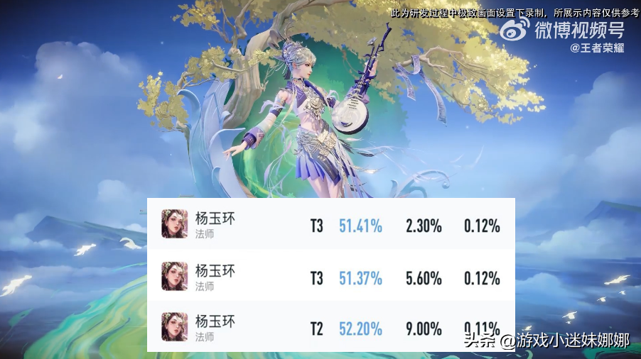 杨玉环她在游戏中的登场率高不高?不高,最低只有2%,最高也才9%,属于T2、T3热度的英雄。