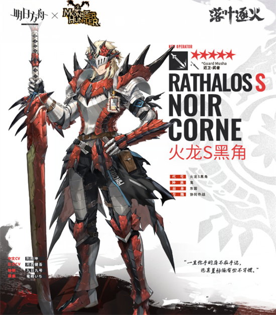火龙S黑角是游戏中的一位联动角色,这位角色目前虽然还没有正式上线,但是游戏已经放出了角色的详细信息了,已经可以从这些信息上来判断这位角色的强度,首先可以知道的是这是一位出身于东国的角色,种族为鬼族,专精为协同作战,外形方面它头上带着雌火龙的面具,身着雌火龙皮毛制成的砍价,手拿雌火龙鳞片制成的大剑,非常的帅气。