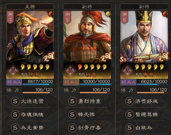 这一套算是一套标准的吴枪阵容了,陆逊走枪兵可以更好的克制一些藤甲兵阵容,另外还有额外的控制作用,如果大家喜欢的话,也是玩一些变种的,例如关妹震慑枪了,但是陆逊的阵容基本上搭配上新装备可以说是有了一些加强吧,至少触发了陆逊的火能够一直存在了,这一点也是比较的关键的!