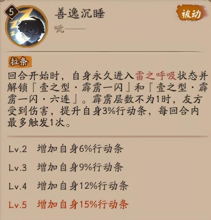 回合开始时,自身永久进入【雷之呼吸】状态并解锁「壹之型·霹雳一闪」和「壹之型·霹雳一闪·六连」。【霹雳】层数不为1时,友方受到伤害,提升自身3%行动条,每回合内最多触发1次。