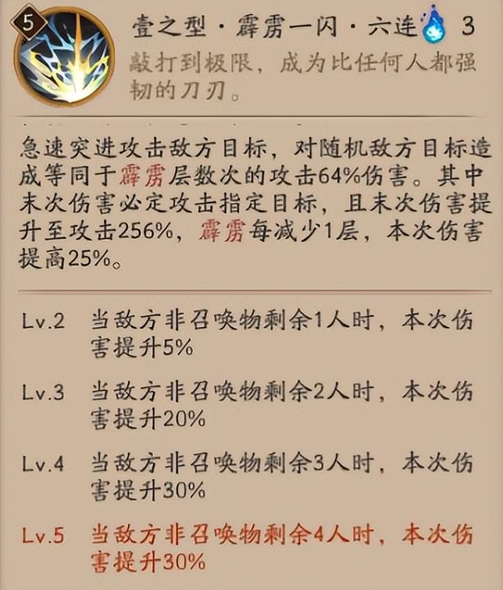 急速突进攻击敌方目标,对随机敌方目标造成等同于【霹雳】层数次的攻击64%伤害。其中末次伤害必定攻击指定目标,且末次伤害提升至攻击256%,【霹雳】每减少1层,本次伤害提高25%。