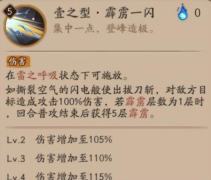 如撕裂空气的闪电般使出拔刀斩,对敌方目标造成攻击100%伤害,若【霹雳】层数为1层时,回合普攻结束后获得5层【霹雳】。