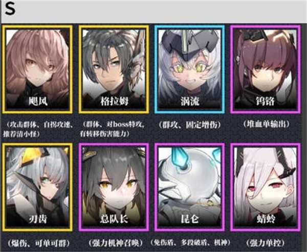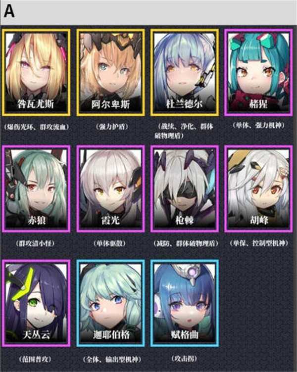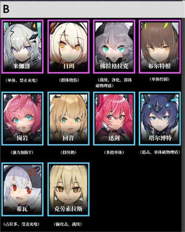 4:a榜为,咎瓦尤斯,阿尔卑斯,杜兰德尔,赤狼,霞光,胡峰,天丛云等;5:b级的就比较次了,米迦洛,布尔特根,回音等等的角色,最后就是c级的;
