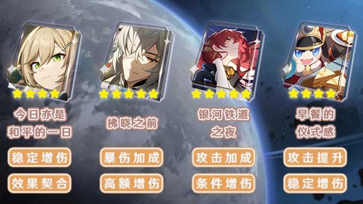 【银河铁道之夜】可以基于场上敌人数量提升青雀的攻击力,当敌人目标被击破时还可以提供增伤加成。