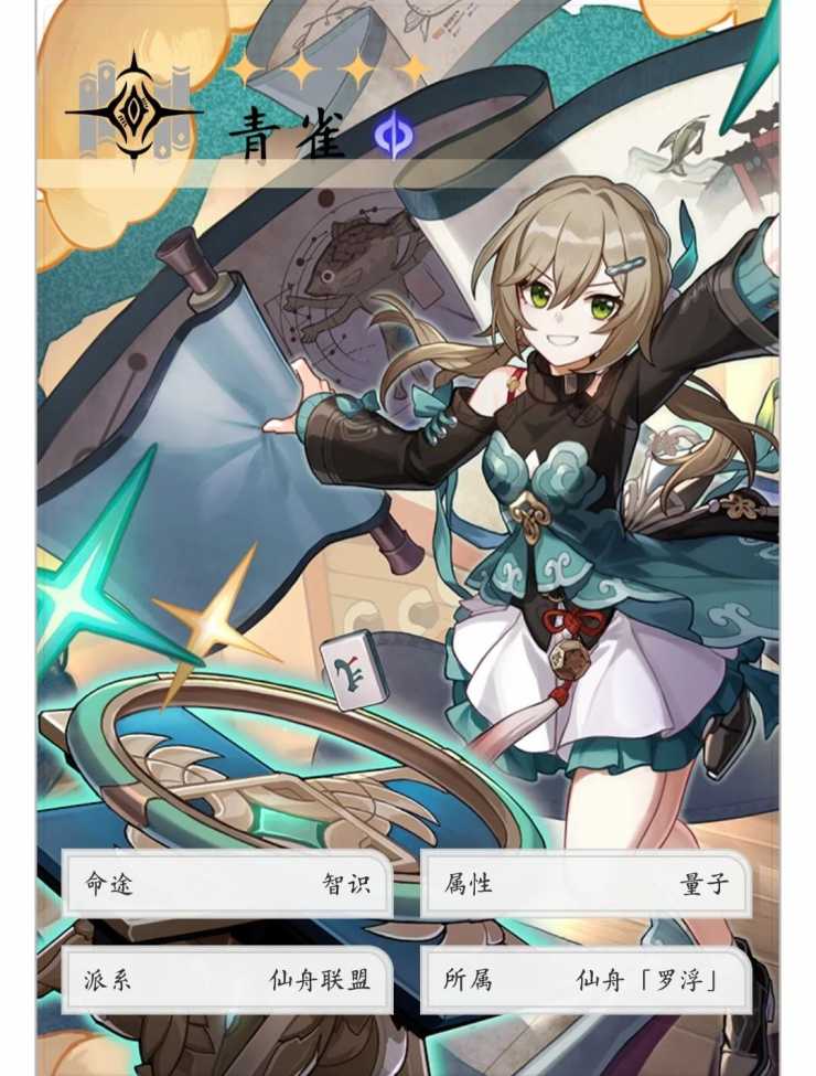 青雀是一名量子属性的「智识」命途角色,我方目标行动开始前青雀会随机抽一张牌,当青雀四张牌花色相同时会进入【暗杠】状态,攻击力提升且获得强化普攻。青雀使用战技可以立即抽两张牌且获得一个额外回合,之后使自己造成的伤害提升;使用终结技可以对敌方全体造成量子属性伤害并使自己手上的牌变为四张【幺鱼】;使用秘技则可以让青雀进入战斗后立即抽两张牌。