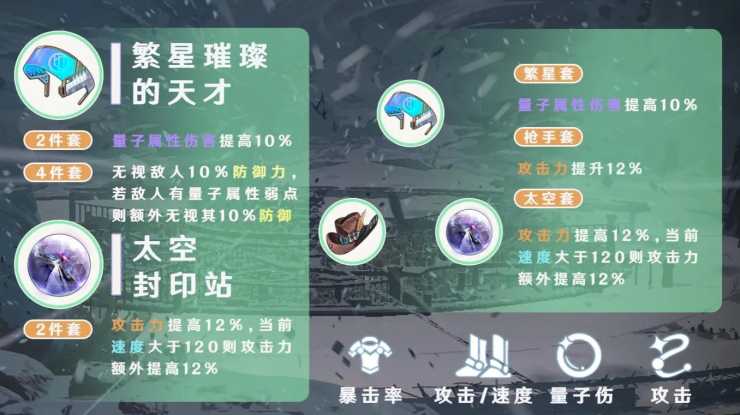 主词条方面,头部和手部为固定的生命值和攻击力属性,躯干选择暴击率,脚部选择攻击力/速度,位面球选择量子属性伤害加成,连结绳选择攻击力。