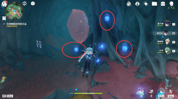 4、然后要寻找解除封印的方法,只要使用普攻键瞄准攻击接触三个机关即可;