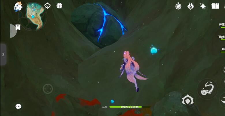 10、以上锁的元素方碑为参照物,从右边可以找到一个单独的水之核,角色在水元素附着的情况下可以使水之核成长为水环,将成为水环的水之核安置。