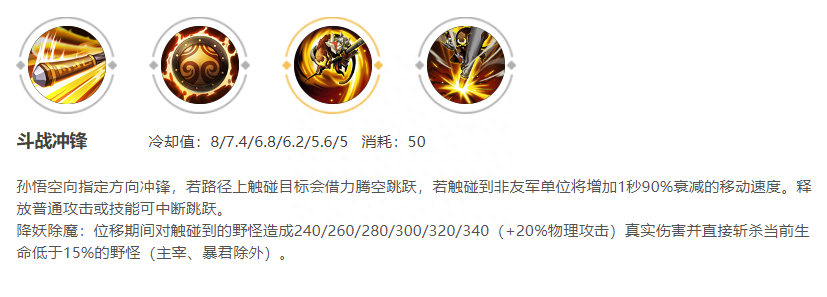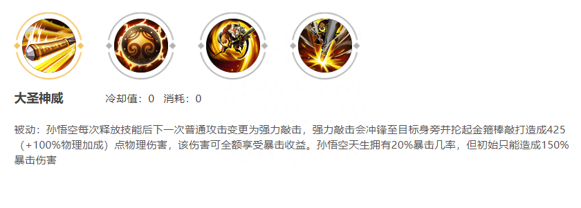 PS:被动还给孙悟空提供初始的20%暴击率和150%暴击效果,但需要注意,如果在强化普攻敲击前又使用技能,敲击会被打断。